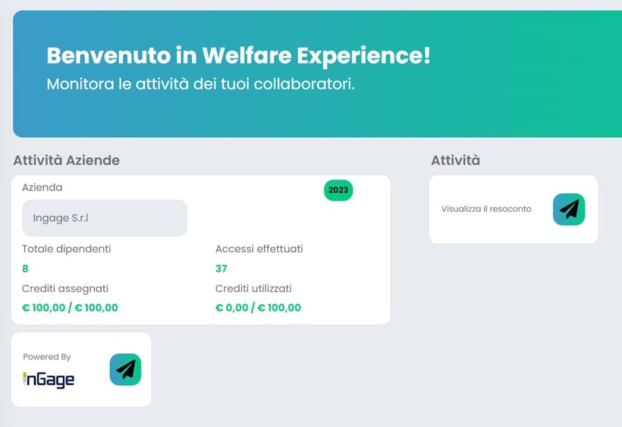 Assolutamente, hai il controllo totale con Welfare Experience. Sia che tu sia un'azienda o un consulente aziendale che gestisce più aziende, hai il potere di guidare autonomamente ogni fase dell'implementazione del piano di welfare aziendale. Puoi monitorare con attenzione i crediti assegnati a ciascun dipendente coinvolto. Questo significa che puoi attribuire il credito spendibile in qualsiasi momento dell'anno o effettuare storni in base alle specifiche esigenze della tua azienda.